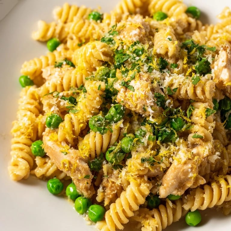 - Toss pasta, chicken, and peas with Parmesan and lemon, adding pasta water until everything gets beautifully coated