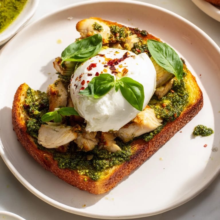 - Spread pesto over each toast, layer on sliced chicken, then tear the burrata directly on top and finish with basil leaves